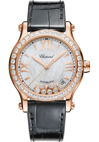 36.00 mm 18k rose gold case with diamonds, diamond-set bezel, crystal with mobile diamonds, white mother-of-pearl dial, self-winding mechanical movement with hours and minutes, seconds, date, black alligator leather strap, pin buckle. Water resistant to 30 meters.
