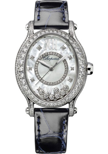 31.31 x 29.00 mm 18k white gold case with diamonds, crystal with mobile diamonds, mother-of-pearl dial with guilloché-worked center, self-winding mechanical movement with hours and minutes, seconds, blue alligator leather strap, pin buckle.