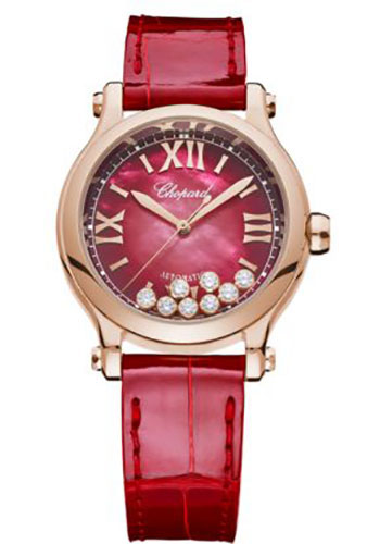 33.00 mm 18k rose gold case with diamonds, red textured mother-of-pearl dial, self-winding mechanical movement with hours and minutes, seconds, approximately 42 hours of power reserve, red alligator leather strap, pin buckle. Water resistant to 30 meters.