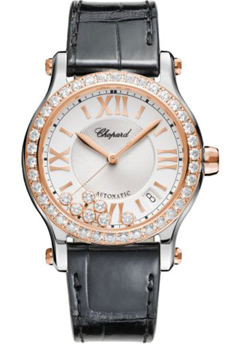 36.00 mm 18k rose gold and stainless steel case with diamonds, diamond-set bezel, crystal with mobile diamonds, silver dial with guilloché-worked center, self-winding mechanical movement with hours and minutes, seconds, date, black alligator leather strap, pin buckle. Water resistant to 30 meters.