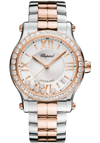 36.00 mm 18k rose gold and stainless steel case with diamonds, diamond-set bezel, crystal with mobile diamonds, silver dial with guilloché-worked center, self-winding mechanical movement with hours and minutes, seconds, date, folding buckle. Water resistant to 30 meters.