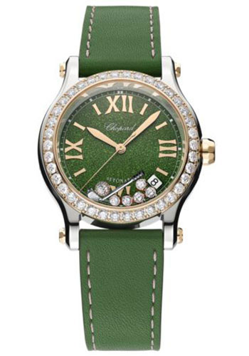36.00 mm 18k rose gold case with diamonds, 12.15 mm thick, grainy green dial, self-winding mechanical movement with hours and minutes, seconds, date, approximately 42 hours of power reserve, green calfskin strap, pin buckle. Water resistant to 30 meters.