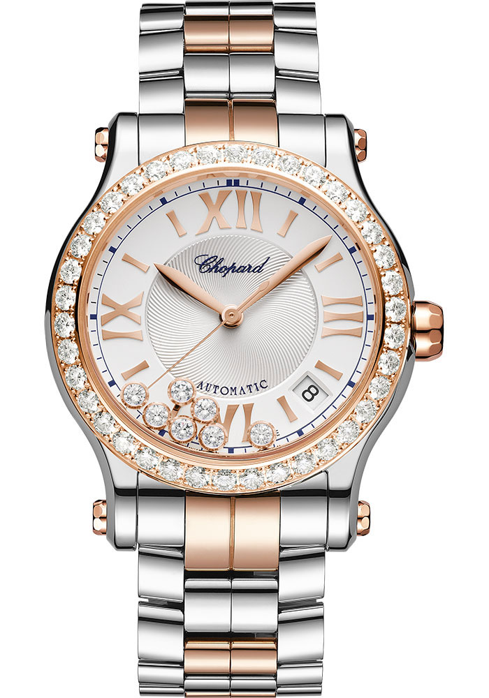 36 mm 18k rose gold and stainless steel case with diamonds, 3.60 mm thick, see-through sapphire crystal back, 18k rose gold crown, crystal with free-spinning gems, silver dial with guilloché center, self-winding mechanical movement with hours and minutes, seconds, date, approximately 42 hours of power reserve, stainless steel folding buckle. Water resistant to 30 meters.
