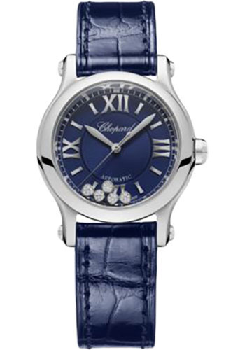 30.00 mm stainless steel case with diamonds, blue dial with guilloché center, self-winding mechanical movement with hours and minutes, seconds, blue alligator leather strap with glossy square plate and hand sewn matching tones, pin buckle. Water resistant to 30 meters.