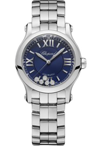 30.00 mm stainless steel case with diamonds, blue dial with guilloché center, self-winding mechanical movement with hours and minutes, seconds, folding buckle. Water resistant to 30 meters.
