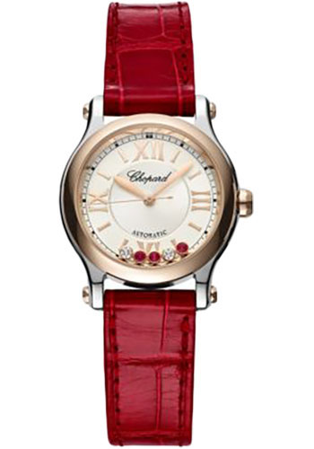30.00 mm stainless steel and 18K rose gold case with diamonds and rubies, silver dial with guilloché center, self-winding mechanical movement with hours and minutes, seconds, red alligator leather strap, pin buckle. Water resistant to 30 meters.
