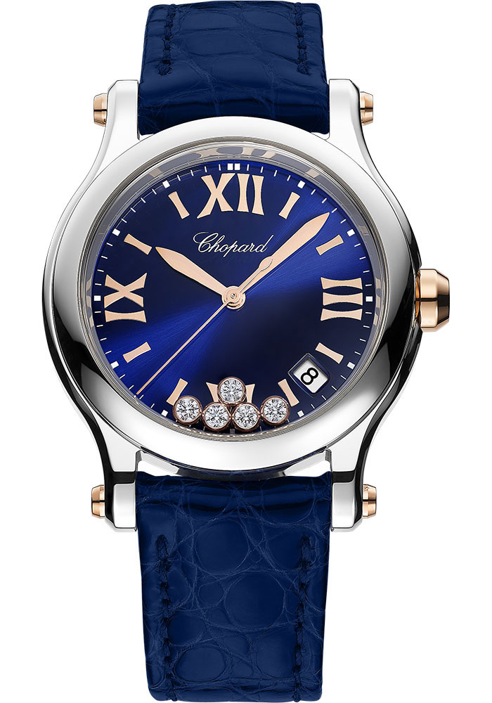36 mm 18k rose gold and stainless steel case with diamonds, 2.50 mm thick, crystal with free-spinning gems, blue dial with sunburst satin-brushed motif, quartz movement with hours and minutes, seconds, date, glossy blue alligator leather strap, stainless steel pin buckle. Water resistant to 30 meters.
