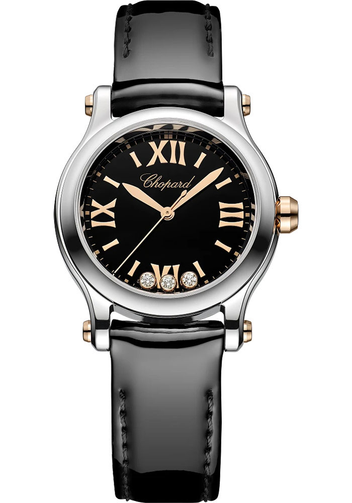 30 mm 18k rose gold and stainless steel case with diamonds, 9.74 mm thick, 18k rose gold crown, crystal with free-spinning gems, deep black lacquered dial, quartz movement with seconds, patent leather black calfskin strap, stainless steel pin buckle. Water resistant to 30 meters.