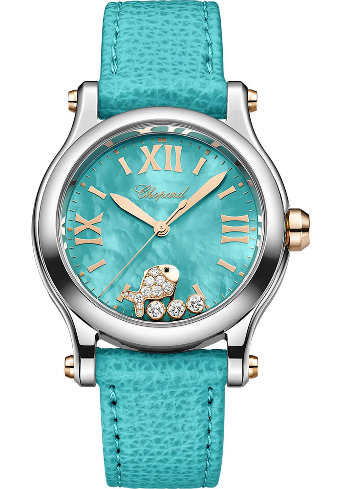 36 mm 18k rose gold and stainless steel case with diamonds, 10.46 mm thick, 18k rose gold crown, crystal with free-spinning gems, turquoise textured mother-of-pearl dial, quartz movement with seconds, hours and minutes, blue calfskin gra strap, stainless steel pin buckle. Water resistant to 30 meters.