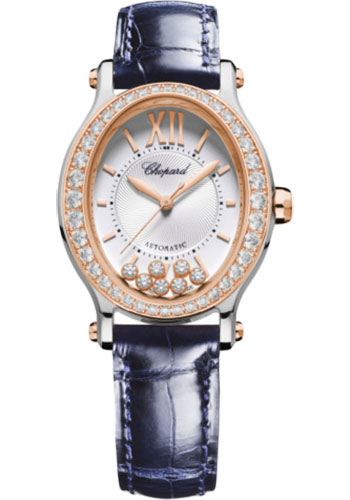 31.31 x 29.00 mm 18k rose gold and stainless steel case with diamonds, crystal with mobile diamonds, silver dial, self-winding mechanical movement with hours and minutes, seconds, blue alligator leather strap, pin buckle. Water resistant to 30 meters.