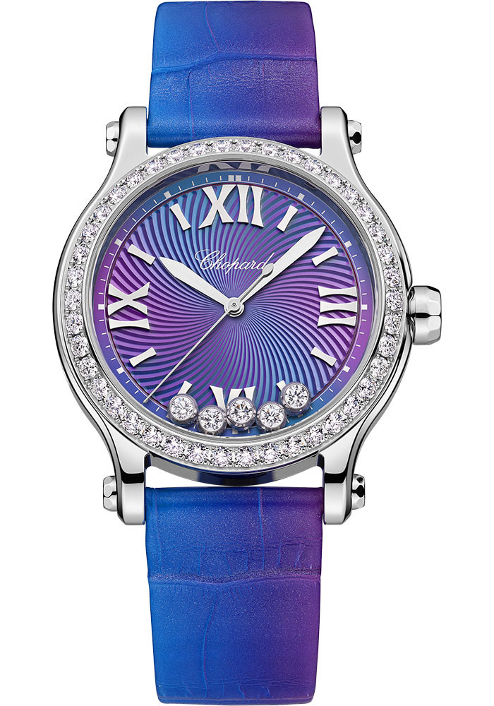 33 mm stainless steel case with diamonds, 3.60 mm thick, see-through sapphire crystal back, 18k rose gold crown, crystal with floating diamonds, purple night dial dial with guiloché decor, self-winding mechanical movement with hours and minutes, seconds, approximately 42 hours of power reserve, nacreous violet alligator leather strap, stainless steel pin buckle. Water resistant to 30 meters.