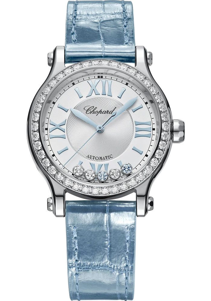 33 mm stainless steel case with diamonds and aquamarines, 10.84 mm thick, see-through sapphire crystal back, stainless steel crown, crystal with free-spinning gems, silver dial dial with a guilloché-worked center enhanced with light blue cvd-coated hour-markers, self-winding mechanical movement with seconds, hours and minutes, approximately 42 hours of power reserve, glossy blue alligator leather strap, stainless steel pin buckle. Water resistant to 30 meters.