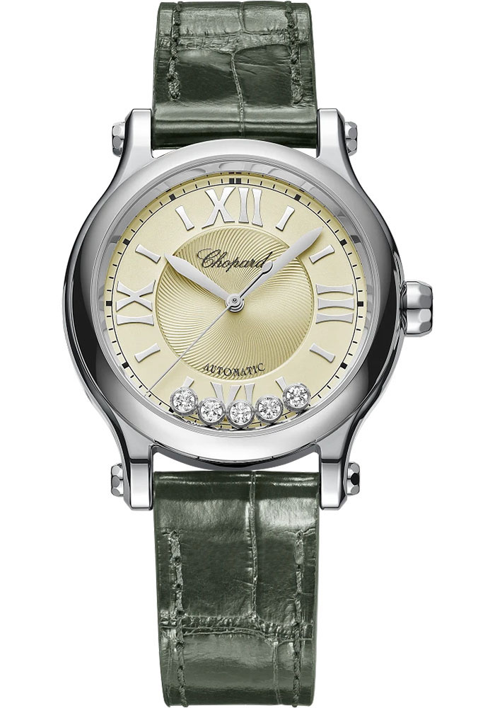 33 mm stainless steel case with diamonds, 10.84 mm thick, see-through sapphire crystal back, stainless steel crown, crystal with free-spinning gems, ivory dial with a guilloché-worked center, self-winding mechanical movement with seconds, hours and minutes, approximately 42 hours of power reserve, glossy gray alligator leather strap, stainless steel pin buckle. Water resistant to 30 meters.