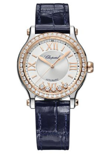 33.00 mm stainless steel and 18K rose gold case with diamonds, 10.84 mm thick, silver dial with guilloché center, self-winding mechanical movement with hours and minutes, seconds, approximately 42 hours of power reserve, blue alligator leather strap, pin buckle. Water resistant to 30 meters.