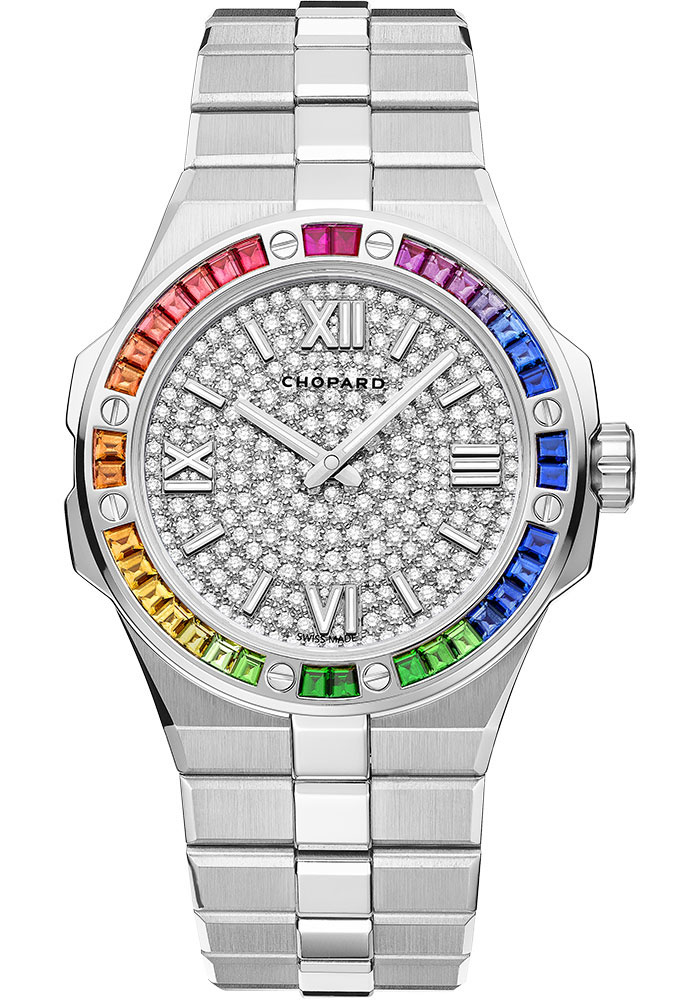 41 mm ethical white gold case with diamonds and colored sapphires, 9.75 mm thick, see-through sapphire crystal back, its gold dial is entirely set with diamonds while the bezel, in 18k white gold entirely set dial with diamonds, self-winding mechanical movement with hours and minutes, approximately 60 hours of power reserve, folding buckle. Water resistant to 100 meters.