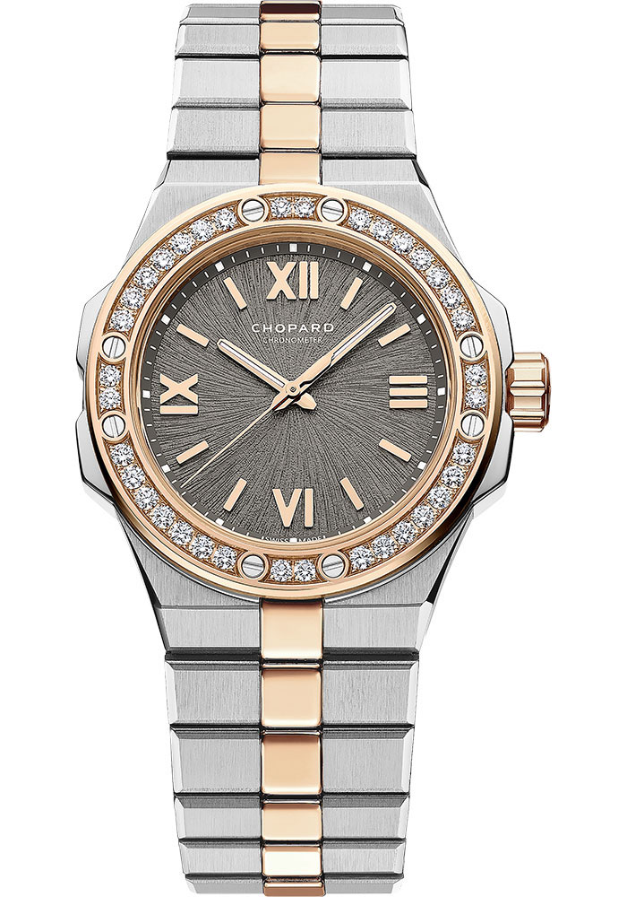 33 mm 18k rose gold and stainless steel case with diamonds, stainless steel crown, bernina gray dial, self-winding mechanical movement with seconds, hours and minutes, approximately 42 hours of power reserve, stainless steel folding buckle. Water resistant to 50 meters.