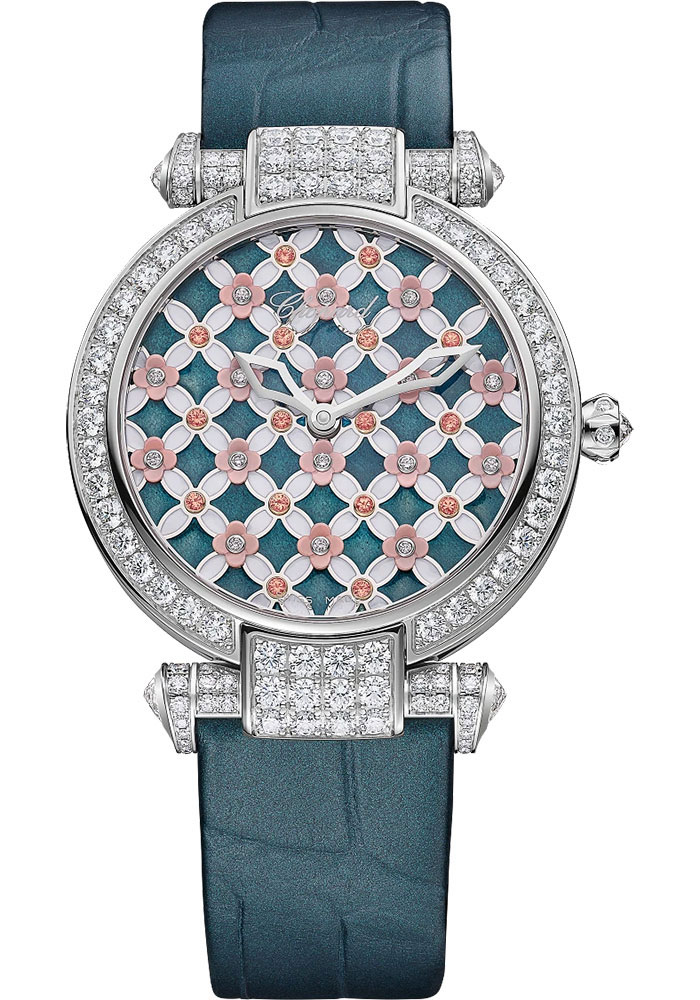 36 mm 18k white gold case with diamonds, 10.38 mm thick, see-through sapphire crystal back, 18k white gold crown, ethical white gold dial base adorned dial with blue-green and white grand feu enamel inserts, self-winding mechanical movement with hours and minutes, approximately 65 hours of power reserve, nacreous green alligator leather strap, pin buckle. Water resistant to 50 meters.