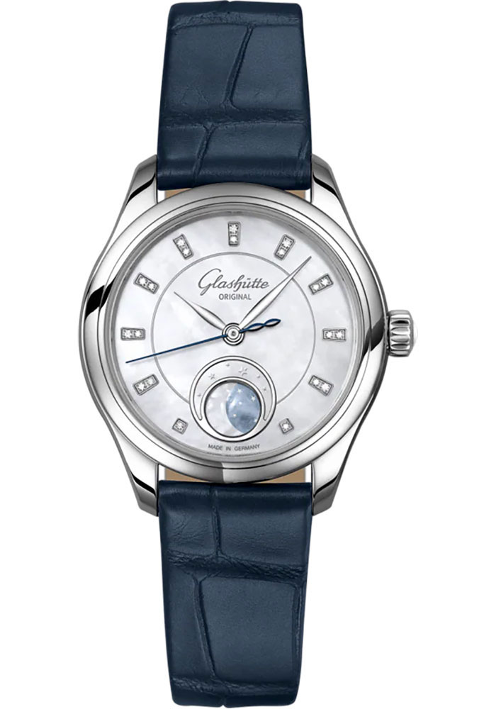 32.50 mm stainless steel case, 8.90 mm thick, sapphire crystal back, mother-of-pearl shimmering white dial with hour appliques in white gold, appliques with 20 brilliant-cut diamonds (total approx. 0.052 ct. tw vvs), applied frame of moon phase display made of white gold, moon phase entirely made of mother-of-pearl (white/blue), blue sky disc printed with silver-coloured stars, Calibre 35-14 automatic movement with hour and minute, second, moon phase, approximately 60 h of power reserve, blue louisiana alligator leather strap, Fold fastener buckle. Water resistant to 3 bar.