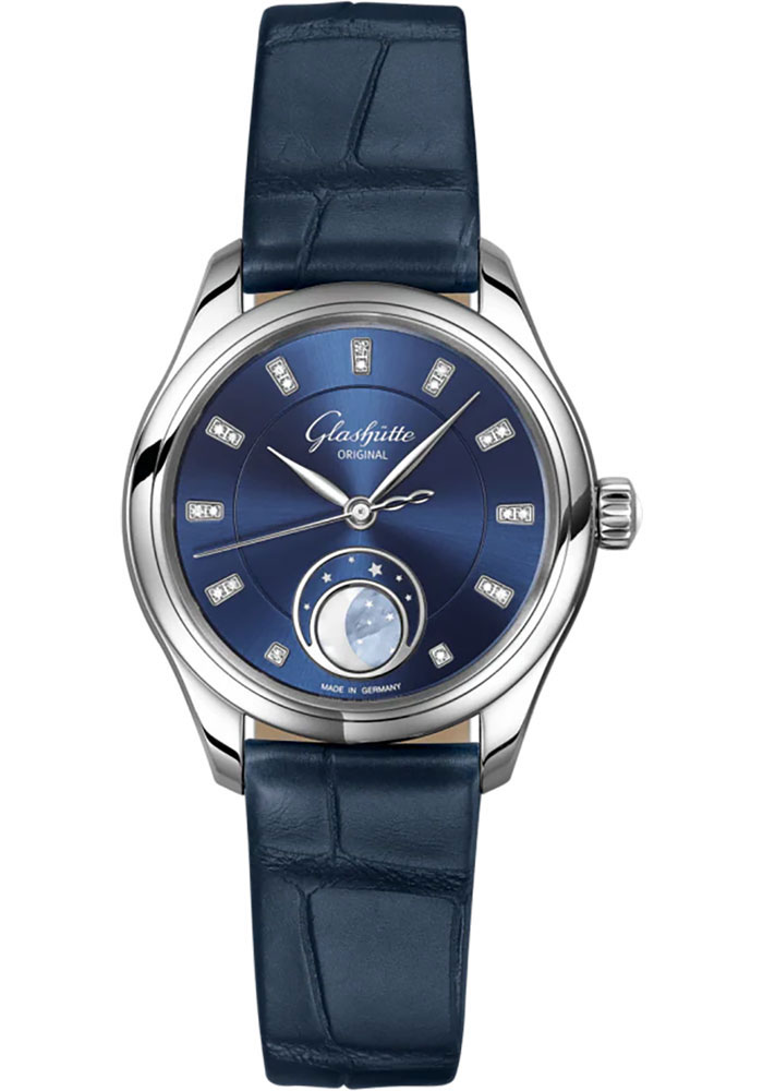 32.50 mm stainless steel case, 8.90 mm thick, radiant blue with sunray finish dial with hour appliques in white gold, appliques with 20 brilliant-cut diamonds (total approx. 0.052 ct. tw vvs), applied frame of moon phase display made of white gold, moon phase entirely made of mother-of-pearl (white/blue), blue sky disc printed with silver-coloured stars, Calibre 35-14 automatic movement with hour and minute, second, moon phase, approximately 60 h of power reserve, blue louisiana alligator leather strap, Fold fastener buckle. Water resistant to 3 bar.
