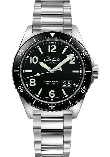 43.20 mm stainless steel case, 15.65 mm thick, centrally screwed sapphire crystal back, screwed crown, bezel with one-directional rotation with ceramic inlay, galvanized black dial with sunburst decoration, indices applied with luminous substance, white panorama date on black background, Calibre 36-13 automatic movement with hour and minute, second, panorama date, approximately 100 h of power reserve, stainless steel bracelet, folding buckle. Water resistant to 30 bar.