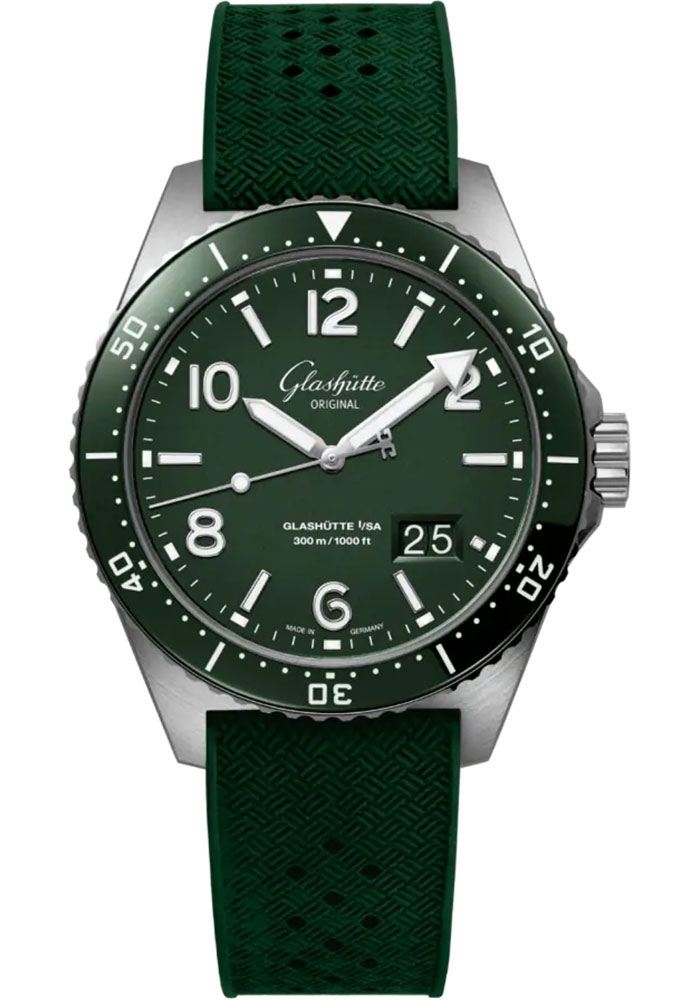 43.20 mm stainless steel case, 15.65 mm thick, screwed crown, bezel with one-directional rotation with ceramic inlay, varnish reed green dial with indices applied with super-luminova® substance, white panorama date on green background, Calibre 36-13 automatic movement with hour and minute, second, panorama date, approximately 100 h of power reserve, green rubber strap, folding buckle. Water resistant to 30 bar.