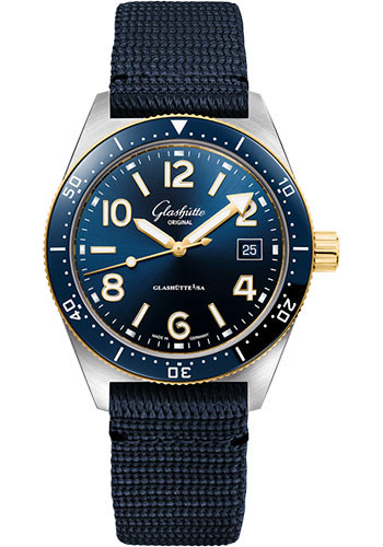 39.50 mm stainless steel and yellow gold case, 12.15 mm thick, closed and engraved back, screwed crown, bezel with one-directional rotation with ceramic inlay, galvanized blue dial with sunburst decoration, applied numerals and indexes with super-luminova, Calibre 39-11 automatic movement with hour and minute, second, date, approximately 40 h ± 5 % of power reserve, blue synthetic strap, folding buckle. Water resistant to 20 bar.