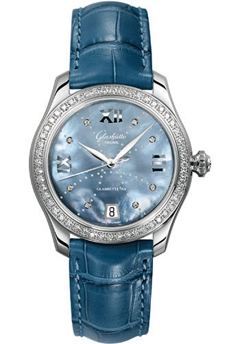 36.00 mm stainless steel case, 10.20 mm thick, sapphire crystal back, bezel set with brilliant-cut diamonds, mother-of-pearl blue dial with 8 brilliant-cut diamonds (approx. 0.04 ct, tw vvs), indices applied, black date on white background, Calibre 39-22 automatic movement with hour and minute, second, date, approximately 40 h ± 5 % of power reserve, blue louisiana alligator leather strap, folding buckle. Water resistant to 5 bar.
