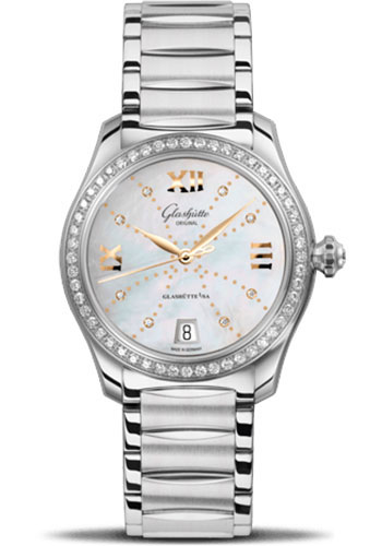 36.00 mm stainless steel case, 10.20 mm thick, sapphire crystal back, bezel set with brilliant-cut diamonds, mother-of-pearl white dial with 8 brilliant-cut diamonds (approx. 0.04 ct, tw vvs), indices applied, black date on white background, Calibre 39-22 automatic movement with hour and minute, second, date, approximately 40 h ± 5 % of power reserve, stainless steel bracelet, folding buckle. Water resistant to 5 bar.