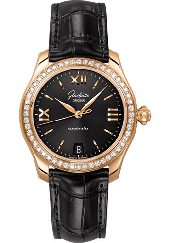 36.00 mm rose gold case, 10.20 mm thick, sapphire crystal back, bezel set with brilliant-cut diamonds, galvanized black dial with sunburst decoration, indices applied, printed scales, white date on black background, Calibre 39-22 automatic movement with hour and minute, second, date, approximately 40 h ± 5 % of power reserve, black louisiana alligator leather strap, folding buckle. Water resistant to 5 bar.
