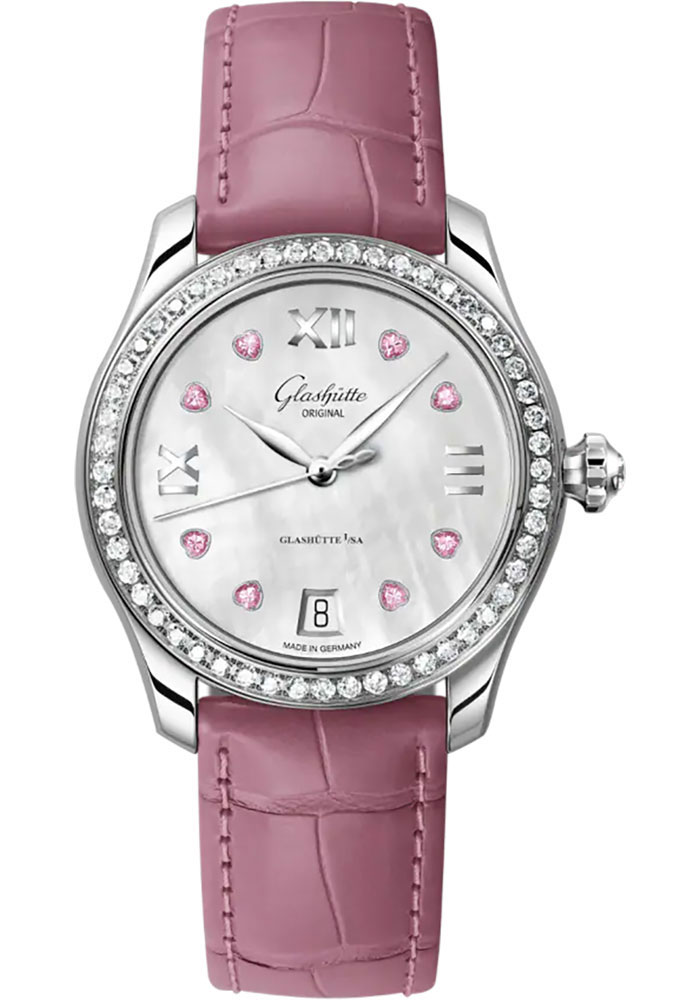 36.00 mm stainless steel case, 10.20 mm thick, mother-of-pearl white dial with applied roman numerals rhodium-plated, 8 applied rose sapphire hearts (approx. 0.20 ct), black date on white background, Calibre 39-22 automatic movement with hour and minute, second, date, approximately 40 h ± 5 % of power reserve, rosé louisiana alligator leather strap, pin buckle. Water resistant to 5 bar.