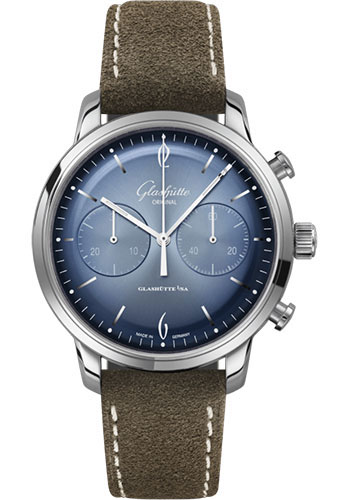 42.00 mm stainless steel case, 12.40 mm thick, galvanized glacier blue dial with dégradé effect, arabic numerals printed in white, markers milled, printed scales, hour markers with luminous spots, Calibre 39-34 automatic movement with hour and minute, chronograph with stop-second, small second, 30 minute counter, approximately 40 h ± 5 % of power reserve, brown calfskin strap, pin buckle. Water resistant to 3 bar.