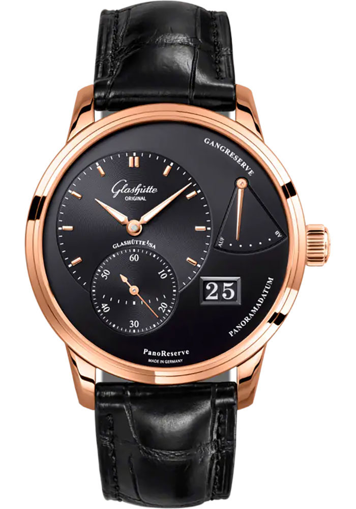 40.00 mm red gold case, 11.70 mm thick, sapphire crystal back, galvanized black dial with indices applied, printed scales, white panorama date on black background, Calibre 65-01 manual winding movement with hour and minute, small second, panorama date, power reserve display, approximately 42 h ± 5 % of power reserve, black louisiana alligator leather strap, folding buckle. Water resistant to 5 bar.