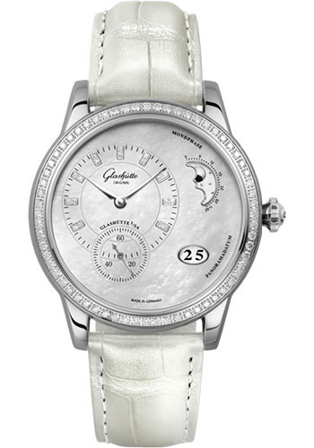 39.40 mm stainless steel case, 12.00 mm thick, sapphire crystal back, bezel set with 64 brilliant-cut diamonds, mother-of-pearl light grey dial with 18 brilliant-cut diamonds (approx. 0.04 ct, tw-vvs), black panorama date on white background, moon phase display silver/silver, Calibre 90-12 automatic movement with hour and minute, small second, panorama date, moon phase, approximately 42 h ± 5 % of power reserve, white and beige louisiana alligator leather strap, pin buckle. Water resistant to 3 bar.
