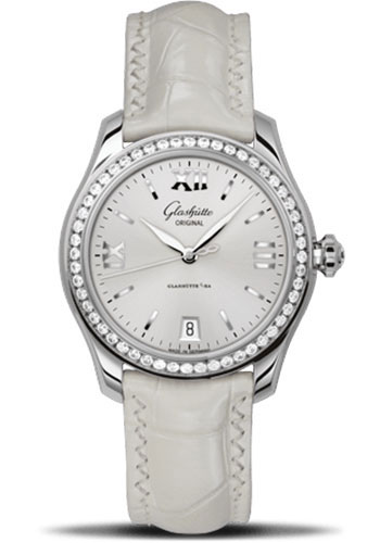 36.00 mm stainless steel case, 10.20 mm thick, sapphire crystal back, bezel set with brilliant-cut diamonds, galvanized silver dial with sunburst decoration, indices applied, printed scales, black date on white background, Calibre 39-22 automatic movement with hour and minute, second, date, approximately 40 h ± 5 % of power reserve, white and beige louisiana alligator leather strap, folding buckle. Water resistant to 5 bar.