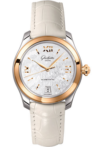 36.00 mm bicolor case, 10.20 mm thick, sapphire crystal back, mother-of-pearl silver dial with indices applied, black date on white background, Calibre 39-22 automatic movement with hour and minute, second, date, approximately 40 h ± 5 % of power reserve, white and beige louisiana alligator leather strap, folding buckle. Water resistant to 5 bar.