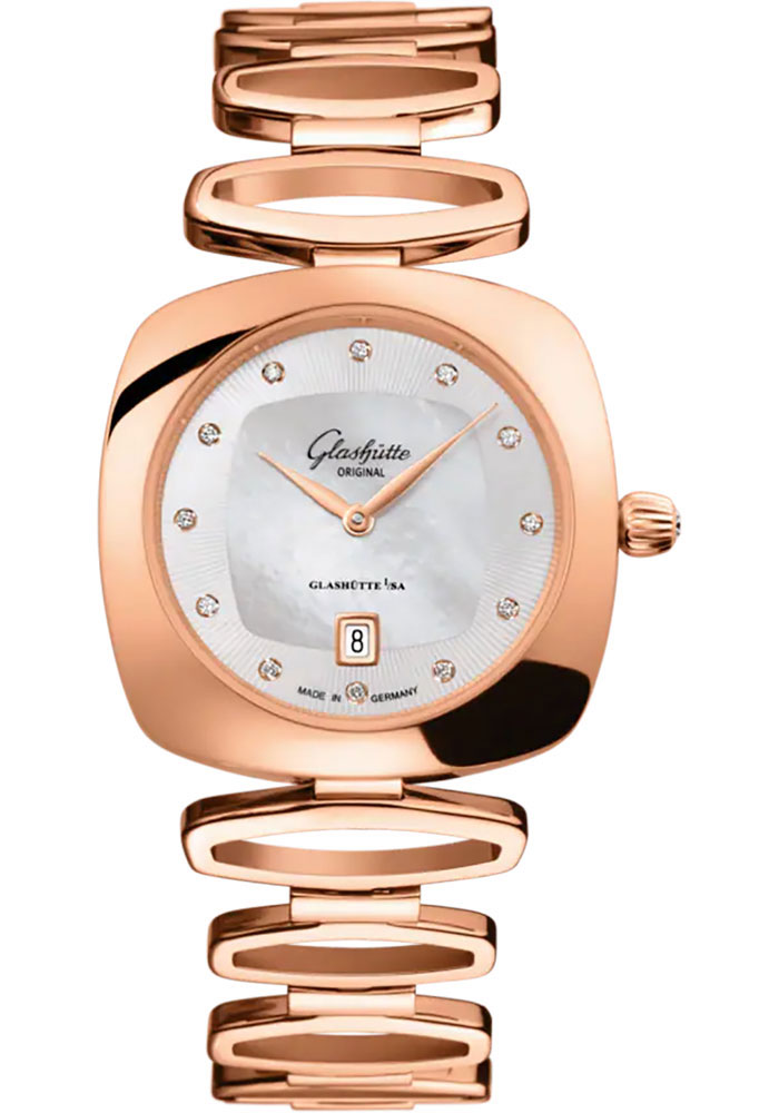31.00 x 31.00 mm red gold case, 7.50 mm thick, mother-of-pearl white dial with guilloches, 12 diamonds (approx. 0.06 ct. tw vvs), black date on white background, Calibre 03-01 quartz movement with hour and minute, date, approximately 48 months with battery at full capacity of power reserve, red gold bracelet, Fold fastener buckle. Water resistant to 5 bar.