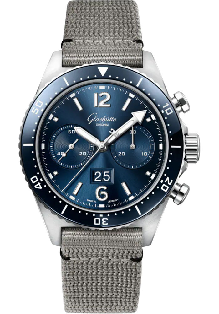 43.20 mm stainless steel case, 16.95 mm thick, screwed crown, bezel with one-directional rotation with ceramic inlay, blue pvd coated dial with indices applied with super-luminova® substance, white panorama date on blue background, Calibre 37-23 automatic movement with hour and minute, stop second chronograph, small second, 30 minute counter, panorama date, flyback, approximately 70 h ± 5 % of power reserve, grey synthetic strap, Fold fastener buckle. Water resistant to 30 bar.