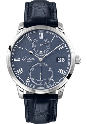 42.00 mm white gold case, 11.40 mm thick, silver-plated dial with galvanized grey, railroad chapter ring, print of scales and letterings in blue, applied roman numeral indices made of gold (750), blue coated, white panorama date on blue background, Calibre 58-08 manual winding movement with hour and minute, small second, panorama date, running time display, day/night indicator, approximately 44 h 40 min of power reserve, blue louisiana alligator leather strap, Fold fastener buckle. Water resistant to 5 bar.