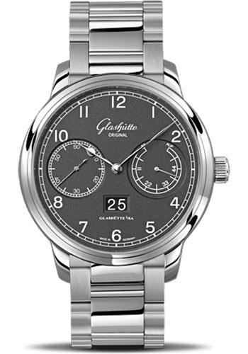 44.00 mm stainless steel case, 12.00 mm thick, sapphire crystal back, varnish grey-grainé dial with railroad chapter ring, arabic numerals, white panorama date on black background, C
