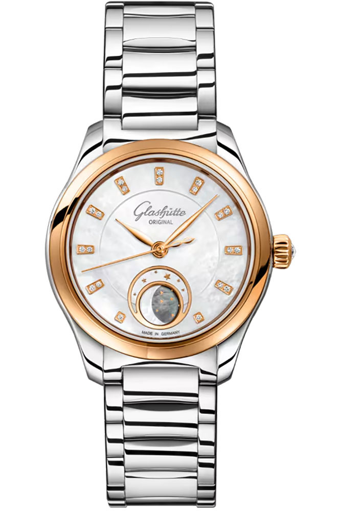 32.50 mm stainless steel and red gold case, 8.90 mm thick, sapphire crystal back, bezel and crown and gently reflect, mother-of-pearl shimmering white dial with hour appliques in red gold, appliques with 20 brilliant-cut diamonds (total approx. 0.052 ct. tw vvs), applied frame of moon phase display made of red gold, moon phase entirely made of mother-of-pearl (white/tahiti), sky disc made of tahiti mother-of-pearl and printed with gold-coloured stars, Calibre 35-14 automatic movement with hour and minute, second, moon phase, approximately 60 h of power reserve, stainless steel bracelet, Fold fastener buckle. Water resistant to 3 bar.