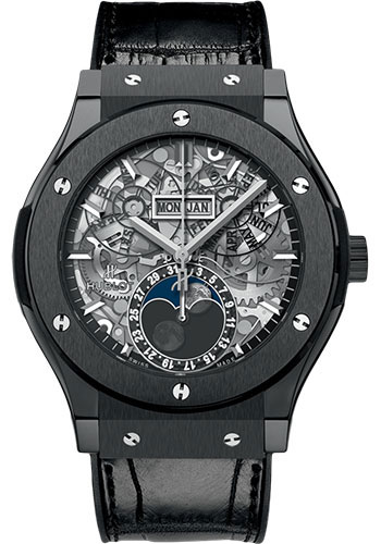 45 mm polished and satin-finished black ceramic case, polished and satin-finished black ceramic bezel with 6 H-shaped titanium screws, sapphire crystal with anti-reflective treatment, sapphire dial with polished rhodium-plated appliques and hands, HUB1131 self-winding movement with Moon Phase movement, approximately 42 hours of power reserve, black rubber and alligator strap, black PVD stainless steel deployant buckle. Water resistant to 50 meters.