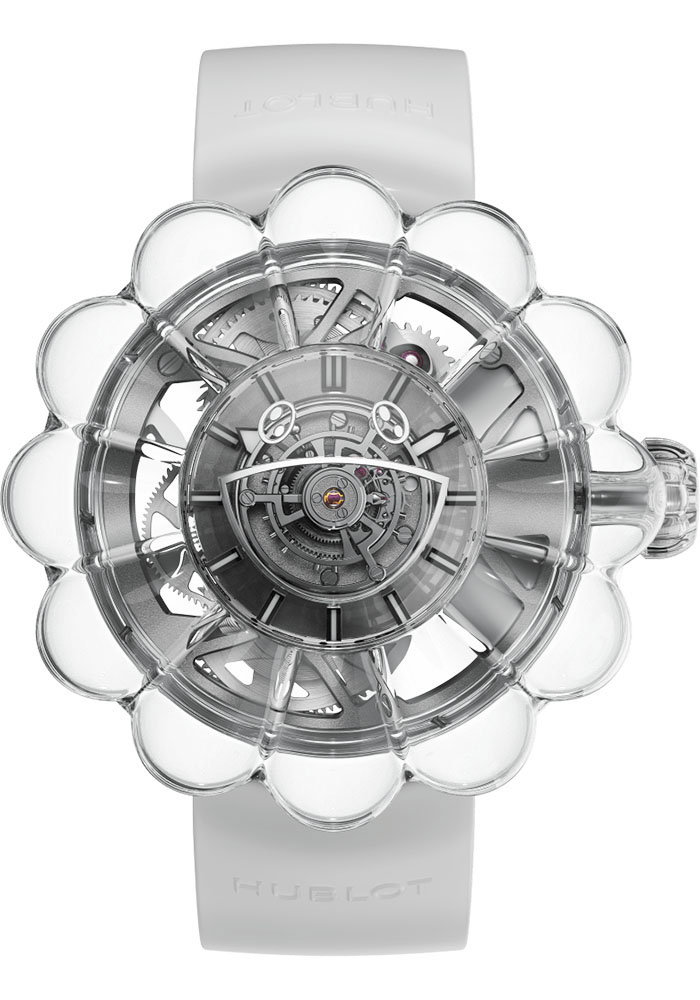 42 mm polished sapphire crystal case, polished titanium bezel set with 444 colored gemstones, sapphire crystal with anti-reflective treatment, polished transparent composite resin dial, HUB9015 movement, approximately 120 hours of power reserve, sapphire crystal and titanium deployant buckle. Water resistant to 30m (3 ATM).