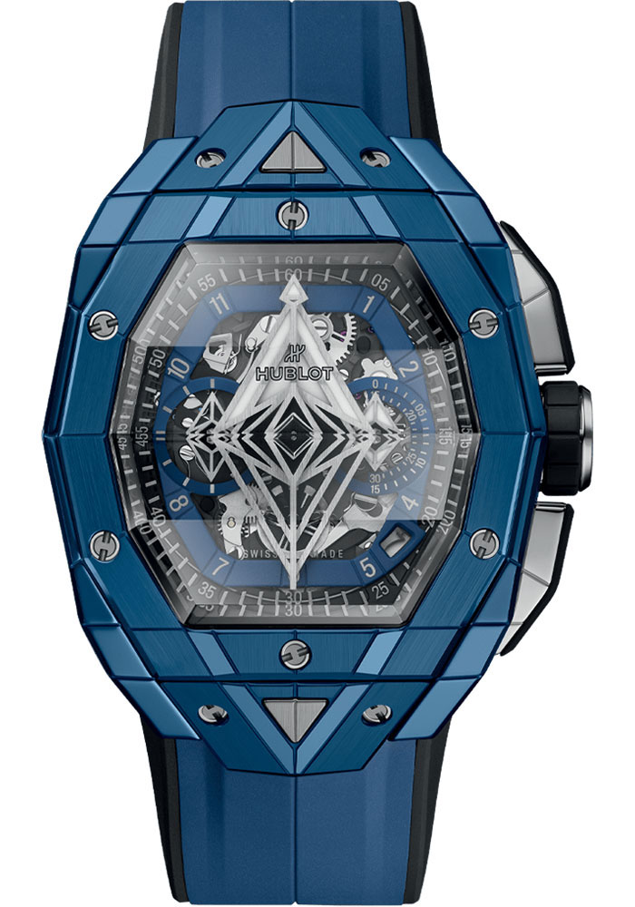 42 mm satin-finished and polished blue ceramic case, satin-finished and polished blue ceramic bezel, sapphire crystal with anti-reflective treatment, sapphire crystal dial, HUB4700 self-winding skeleton chronograph movement, approximately 50 hours of power reserve, black and blue rubber strap, black ceramic and black-plated titanium deployant buckle. Water resistant to 100m (10 ATM).