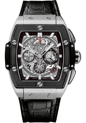 42 mm satin-finished and polished titanium case, satin-finished, polished and microblasted black ceramic bezel with 6 h-shaped titanium screws, sapphire crystal with anti-reflective treatment, sapphire dial, HUB4700 self-winding skeleton chronograph movement, approximately 50 hours of power reserve, black structured lined rubber strap, titanium deployant buckle. Water resistant to 100m (10 ATM).
