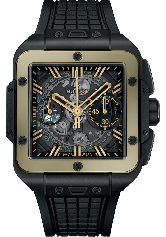 42 mm microblasted and polished black ceramic case, polished 18K magic gold bezel with 6 h-shaped black-plated titanium screws, sapphire crystal with anti-reflective treatment, sapphire crystal dial, HUB1280 UNICO manufacture self-winding chronograph flyback movement, approximately 72 hours of power reserve, black structured rubber strap, black ceramic and black-plated titanium deployant buckle. Water resistant to 100m (10 ATM).