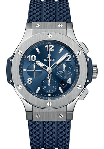 44 mm polished and satin-finished stainless steel case, vertical satin-finished stainless steel bezel with 6 h-shaped titanium screws, sapphire crystal with anti-reflective treatment, blue sunray satin-finished dial, HUB4100 self-winding chronograph movement, approximately 42 hours of power reserve, blue structured rubber strap, stainless steel deployant buckle. Water resistant to 100m (10 ATM).