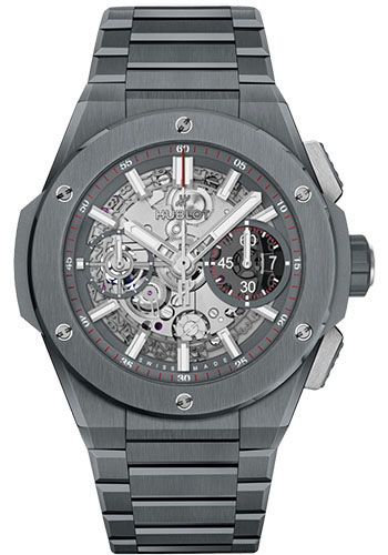 42 mm satin-finished and polished grey ceramic case, satin-finished and polished grey ceramic bezel, sapphire crystal with anti-reflective treatment, mat grey skeleton dial, HUB1280 UNICO manufacture self-winding chronograph flyback movement, approximately 72 hours of power reserve, satin-finished and polished grey ceramic bracelet, titanium deployant buckle. Water resistant to 100m (10 ATM).
