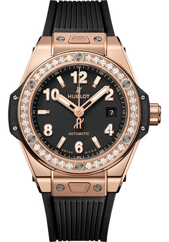 33 mm polished and satin-finished 18k king gold case, polished 18K king gold bezel set with 36 diamonds for 0.76ct, sapphire crystal with anti-reflective treatment, matte black dial, HUB1120 self-winding movement, approximately 40 hours of power reserve, black structured lined rubber strap, 18K king gold and black-plated stainless steel deployant buckle. Water resistant to 100m (10 ATM).