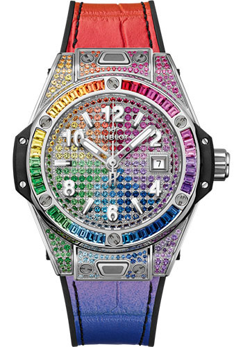 33 mm polished stainless steel case set with 130 colored gemstones : rubies, pink sapphires, amethysts, blue sapphires, blue topazes, tsavorites, yellow and orange sapphires, polished 18K white gold bezel set with 42 baguette-cut colored gemstones, sapphire crystal with anti-reflective treatment, dial set with, HUB1120 self-winding movement, approximately 40 hours of power reserve, black rubber and multicolored alligator leather strap, stainless steel deployant buckle. Water resistant to 100m (10 ATM).