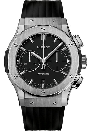 45 mm satin-finished and polished titanium case, vertical satin-finished titanium bezel with 6 h-shaped titanium screws, sapphire crystal with anti-reflective treatment, matte black dial, HUB1143 self-winding chronograph movement, approximately 42 hours of power reserve, black lined rubber strap, stainless steel deployant buckle. Water resistant to 50m (5 ATM).